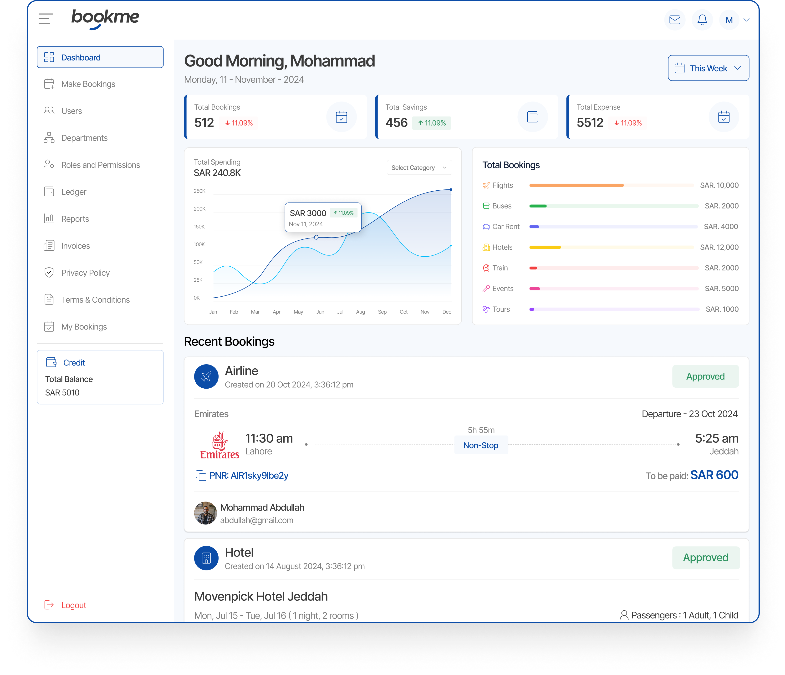 Track expenses by department, employee, or project. Bookme’s portal offers detailed ledgers, customized reports, and complete cost visibility.