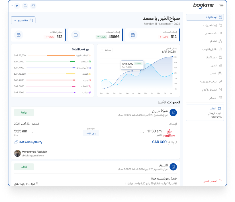 من الحجوزات الفورية إلى التقارير المفصلة، الفواتير، وإدارة السجلات، تقدم بوابتنا كل ما تحتاجه لتبسيط تجربة السفر الخاصة بشركتك - كل ذلك في مكان واحد.